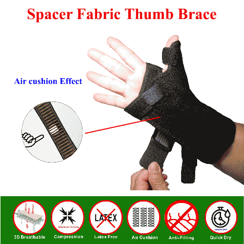 This Thumb splint is made by Spacer Fabric. Spacer fabric should be one of the best sport & Medical brace material in the world.Only Spacer fabric has an air cushion effect. Most of spacer fabric in the market does not have enough compression. We We use our Patented technique to make medical compression Spacer Fabric.